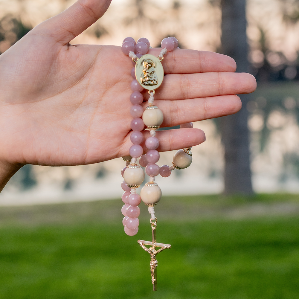Este rosario está inspirado en la ternura, la esperanza y la gracia que acompañan a toda mujer que vive el regalo de la maternidad. Cada cuenta en tonos rosados simboliza el amor que crece silenciosamente en el corazón de una madre, y las cuentas en tonos crema evocan la pureza, la paz y la luz que envuelve este tiempo de espera.